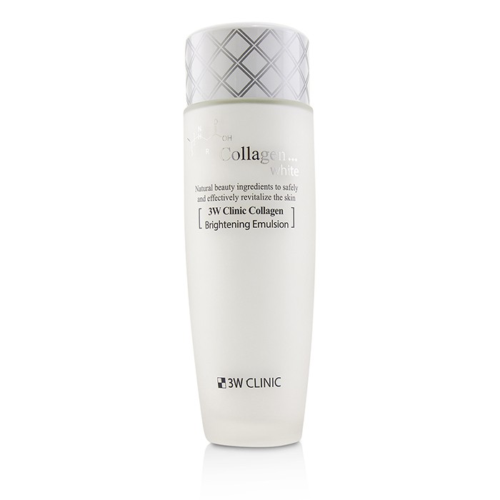3W Clinic Collagen White Brightening Emulsion chứa collagen thủy phân, giúp tăng cường độ đàn hồi cho da, giảm thiểu nếp nhăn và mang lại làn da mịn màng. Bên cạnh đó, sản phẩm còn được bổ sung các chiết xuất tự nhiên như chiết xuất từ hoa cúc và vitamin E, giúp làm sáng da, ngăn ngừa sự hình thành của melanin, mang lại làn da đều màu và rạng rỡ.