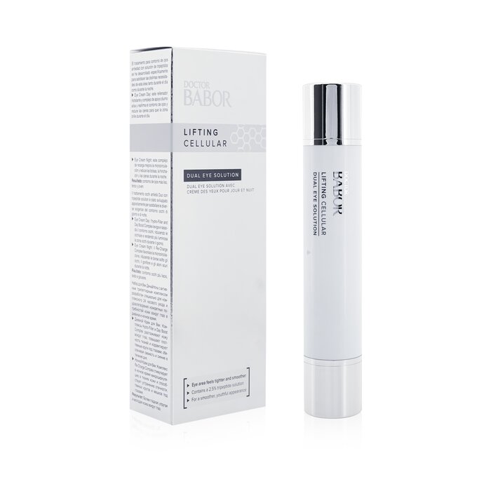 Babor Doctor Babor Lifting Cellular Dual Eye Solution bao gồm hai phần riêng biệt, giúp tối ưu hóa hiệu quả chăm sóc da. Phần serum giàu dưỡng chất giúp làm sáng và giảm bọng mắt, trong khi phần kem cung cấp độ ẩm sâu, làm mờ nếp nhăn và cải thiện độ đàn hồi của da.
