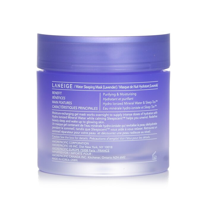 Sản phẩm chứa chiết xuất oải hương tự nhiên, không chỉ mang lại hương thơm dễ chịu mà còn giúp thư giãn tinh thần, hỗ trợ giấc ngủ sâu hơn. Bên cạnh đó, Laneige Water Sleeping Mask còn chứa các thành phần như chiết xuất từ cây mận, nước khoáng và công nghệ Sleep-Tox giúp loại bỏ độc tố, phục hồi làn da sau một ngày dài.