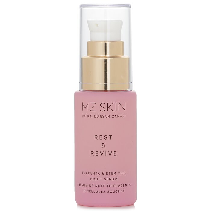 Serum đêm Mz Skin Rest Revive với tế bào gốc nhau thai, phục hồi và trẻ hóa da, mang lại làn da tươi trẻ rạng rỡ.