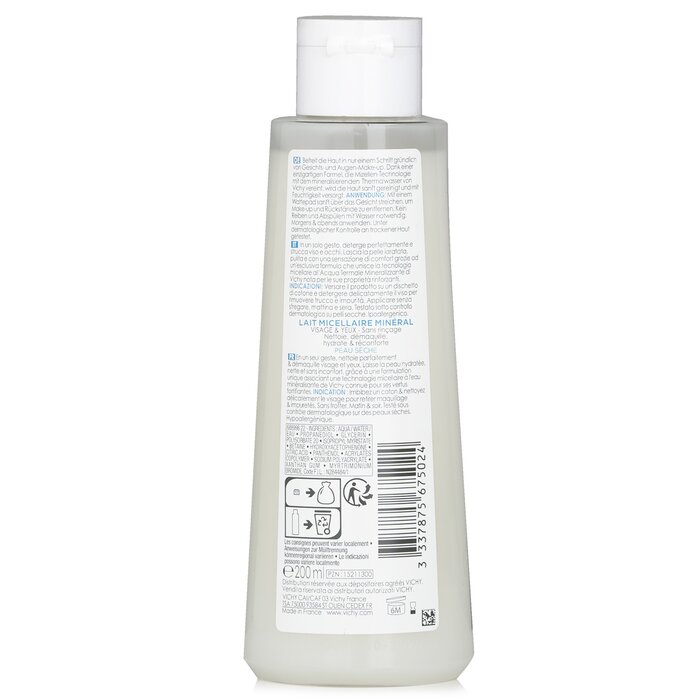 Sữa tẩy trang Vichy Purete Thermale cho da khô, làm sạch và dịu nhẹ, bảo vệ da, 200ml. Ideal cho làn da nhạy cảm.
